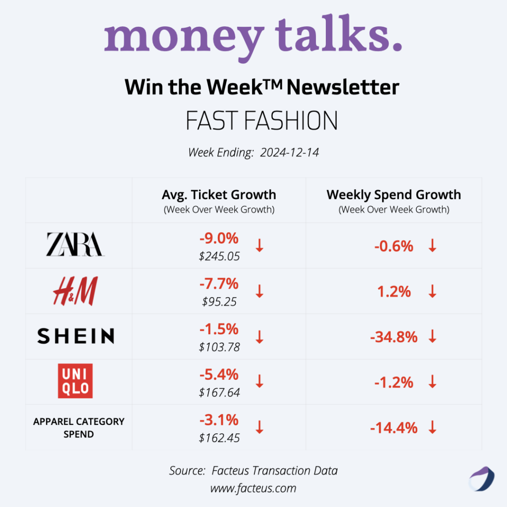 The big-picture for fast fashion spending last week resulted in the following: